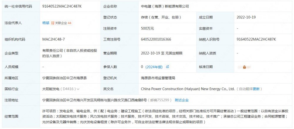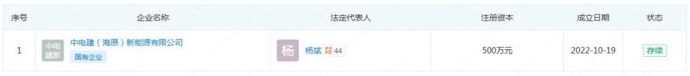 企查查顯示,10月13日,中電建(海原)新能源有限公司沙坡頭區分公司成立,法定代表人:楊斌,企業類型:有限責任公司分公司(國有獨資)。