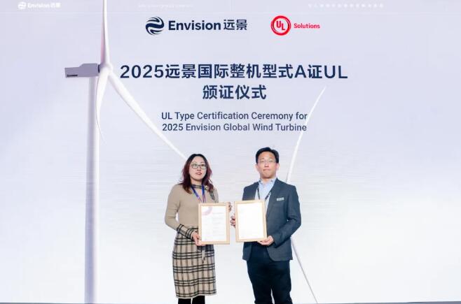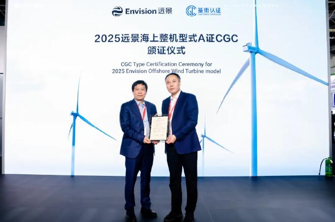 遠景能源始終堅持“長期主義”,將風機產品的可靠性做到極致。在中電聯發布的《2024年度電力行業風電運行指標對標結果》中,遠景Model Y平臺海上機組憑借穩定高效的實戰表現,在山東、江蘇、浙江海上機組可利用率指標領跑。10月20日,中國可再生能源學會風能專業委員會秘書長、北京鑒衡認證中心主任秦海巖來到遠景展臺現場,為遠景Model Y平臺EN-252/11海上智能風機頒發鑒衡型式A證。他表示,遠景能源一直引領行業理性發展,用更高的可靠性和更低的度電成本帶動行業持續前行。