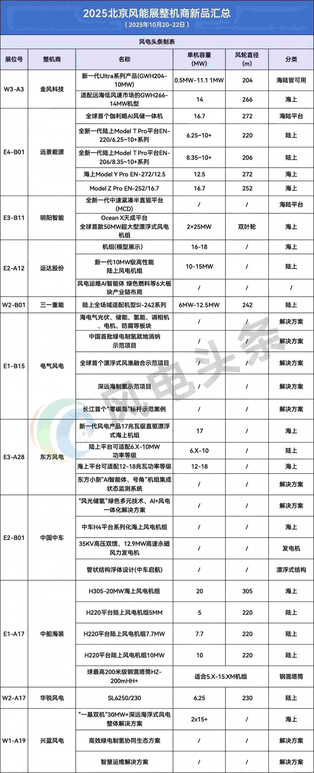 風電展最吸引眼球的依然是幾大風電整機商的展臺,風電頭條不完全統計,11家整機商今年都有發布新品。單機規模范圍為0.5MW至20MW。其中能適用于海上風電項目的產品有13個,純陸上風電可用的新產品有9個。從數量上對比,海上風電已經成為整機商關注的重點領域。
