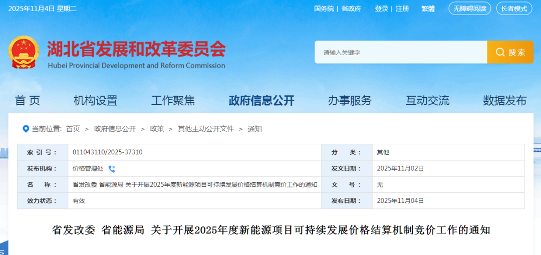風電頭條獲悉,11月4日,湖北省發改委發布《省發改委 省能源局 關于開展2025年度新能源項目可持續發展價格結算機制競價工作的通知》。