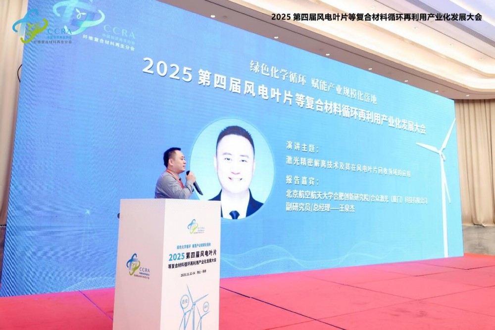 北京航空航天大學合肥創新研究院/合眾激光(廈門)科技有限公司副研究員/總經理王泉杰帶來《激光精密解離技術及其在風電葉片回收領域的應用》分享報告。