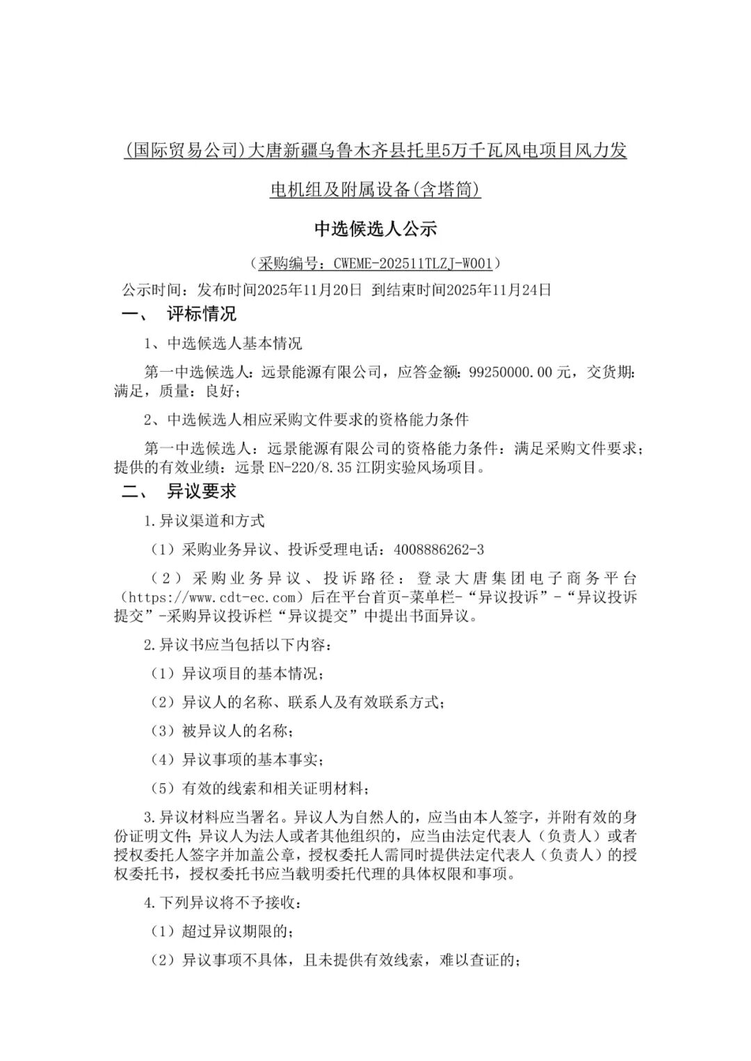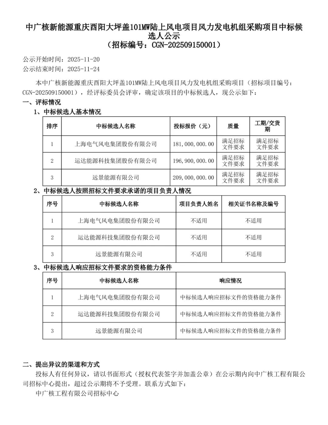 根據公示,遠景能源、電氣風電作為第一中標候選人預中標。