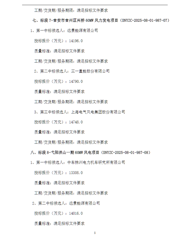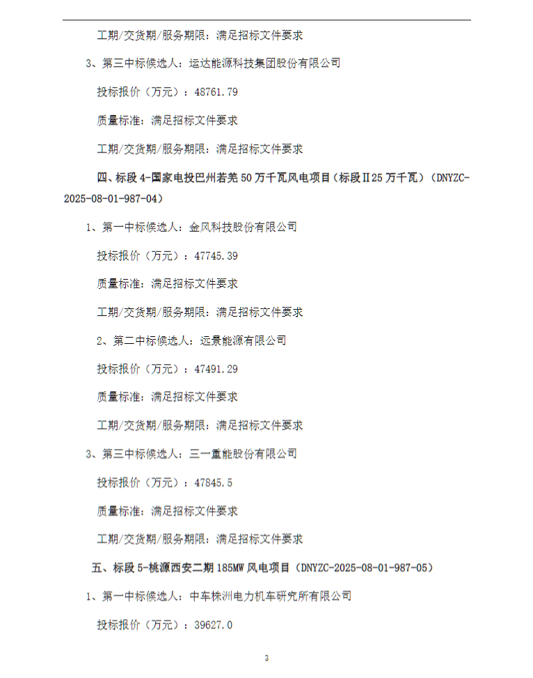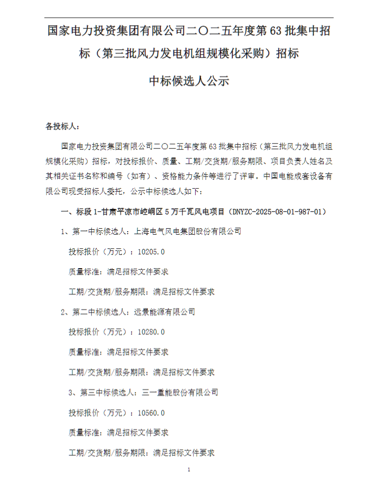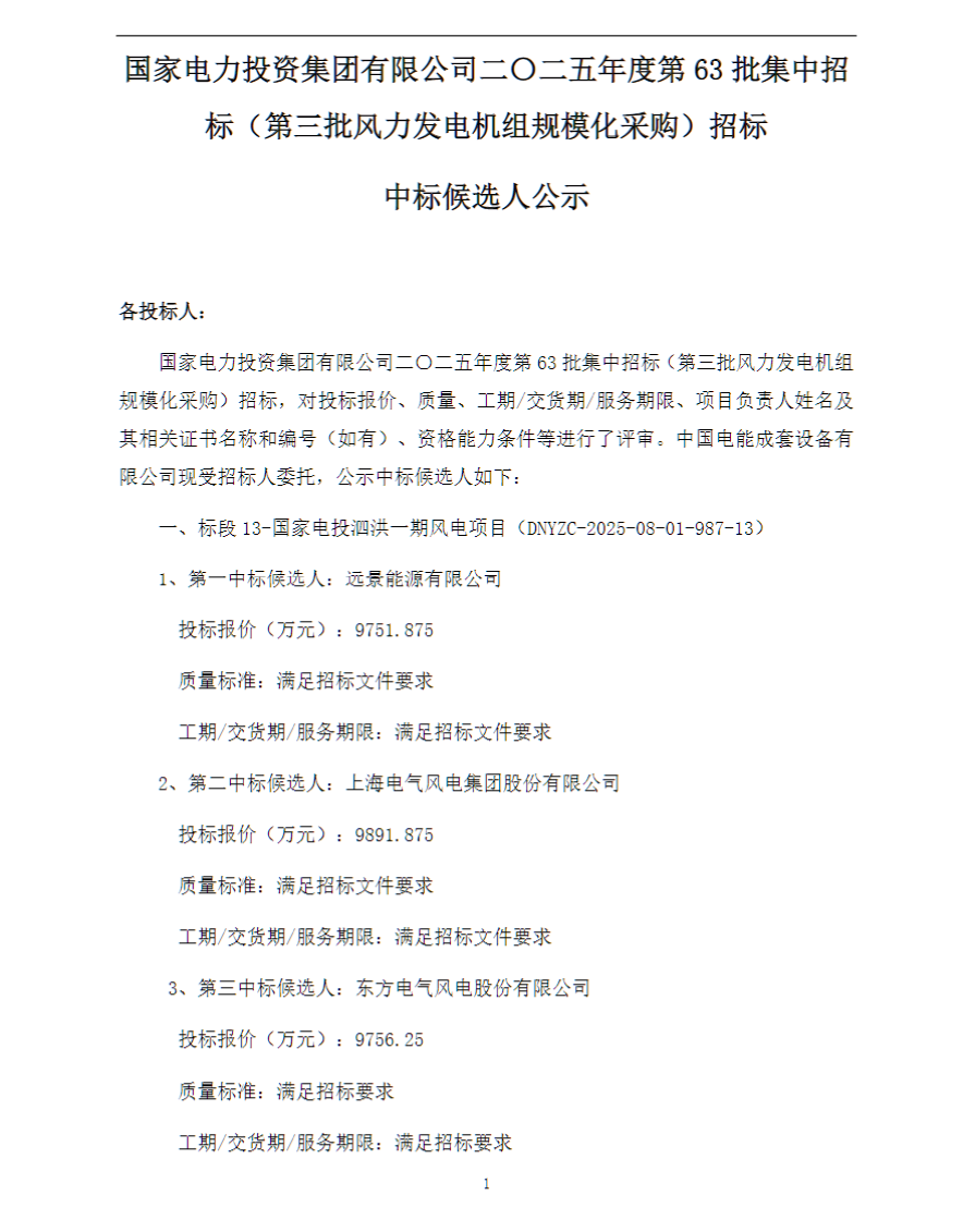 遠景能源、中車株洲所、金風科技作為第一中標候選人預中標。