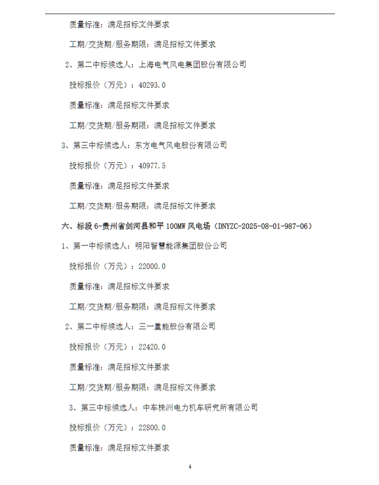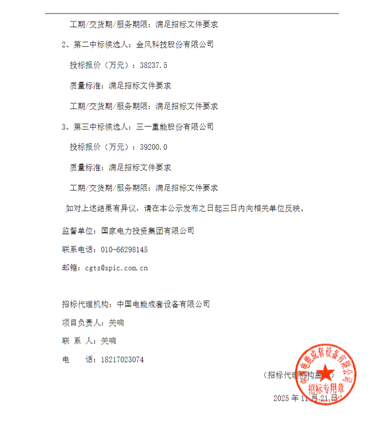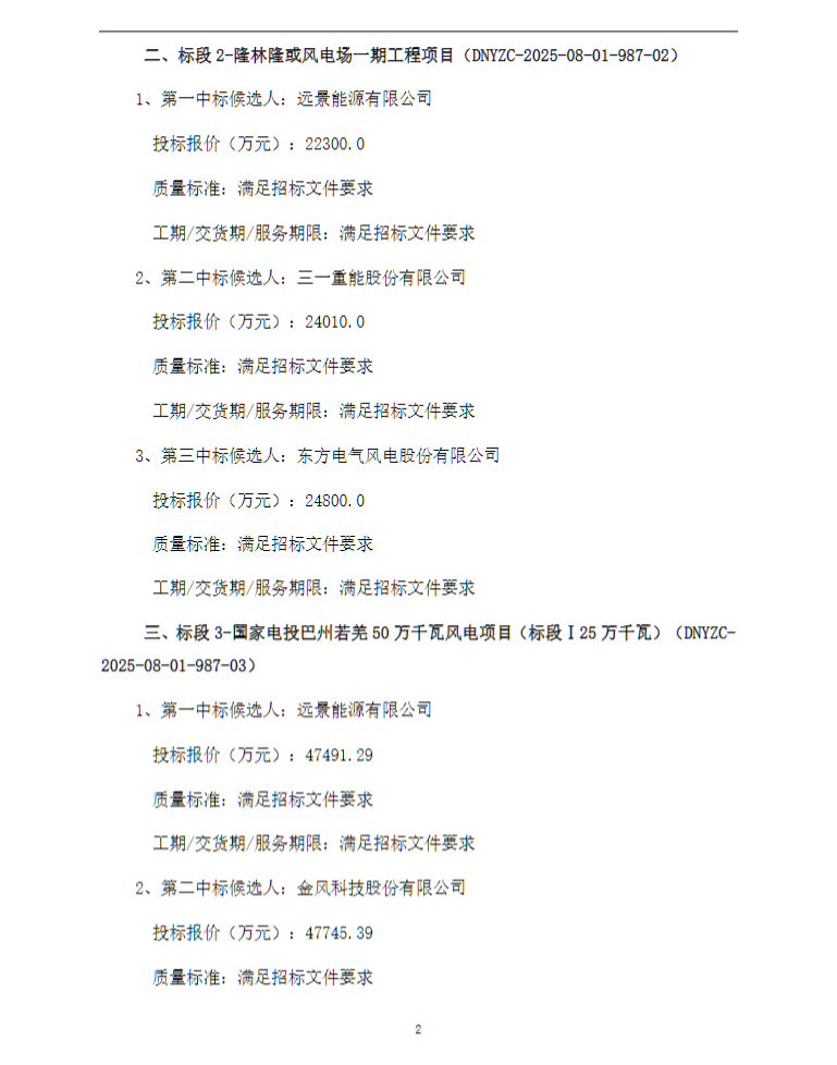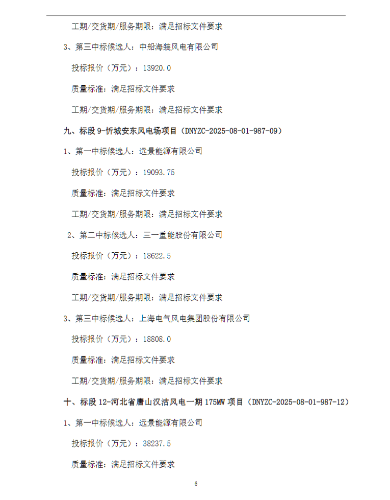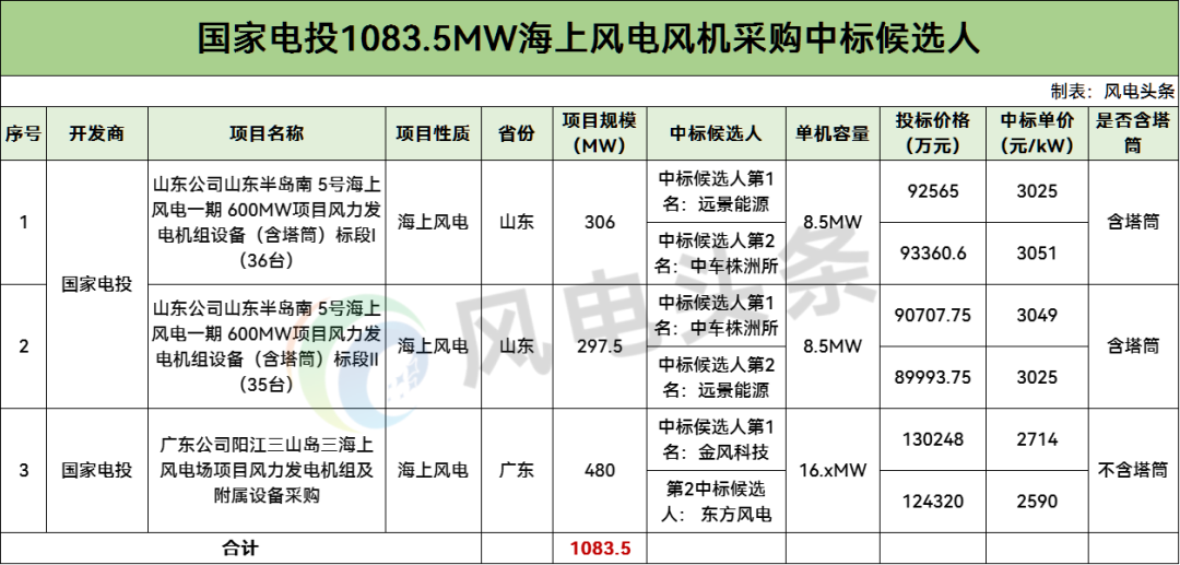 遠景能源、中車株洲所、金風科技作為第一中標候選人預中標。