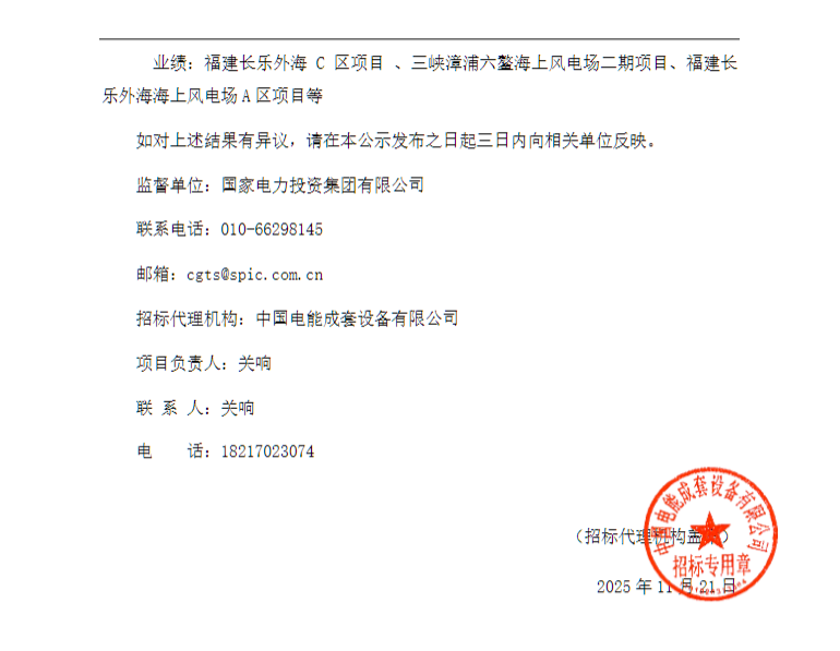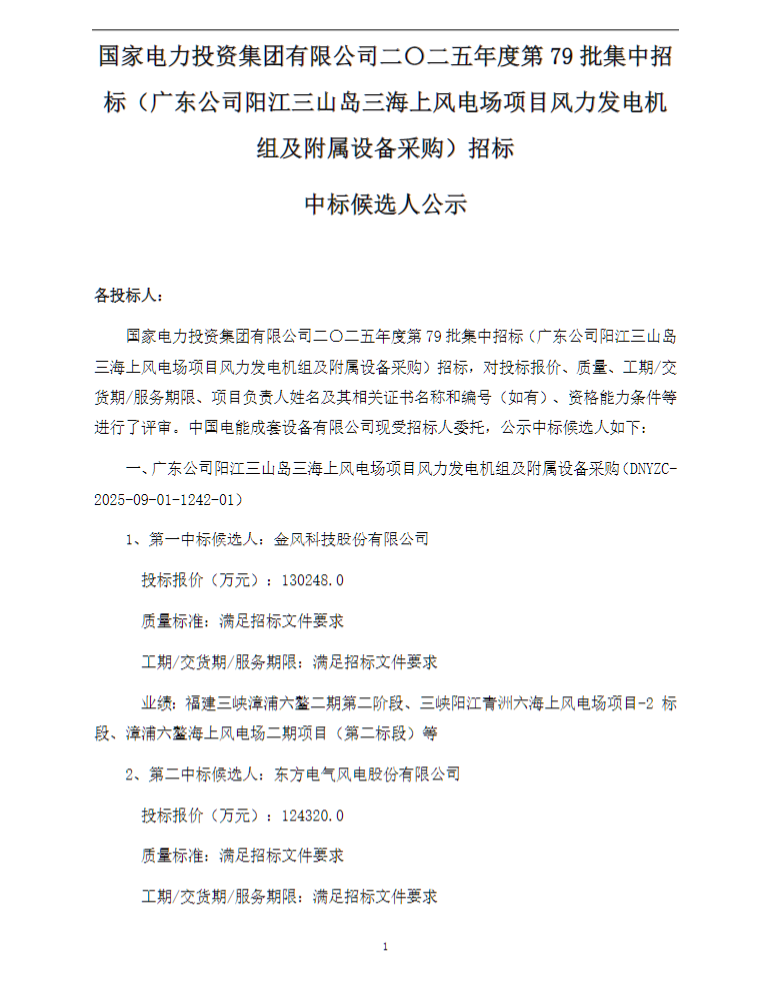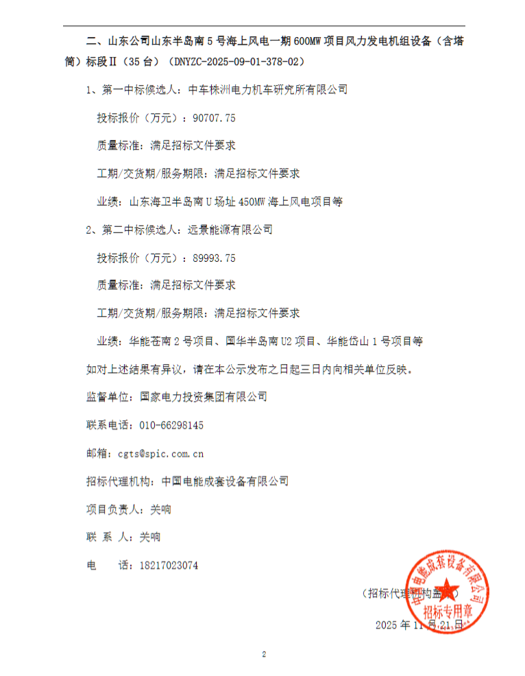 根據山東公司山東半島南5號海上風電一期600MW項目、廣東公司陽江三山島三海上風電場項目風力發電機組及附屬設備采購中標候選人公示。