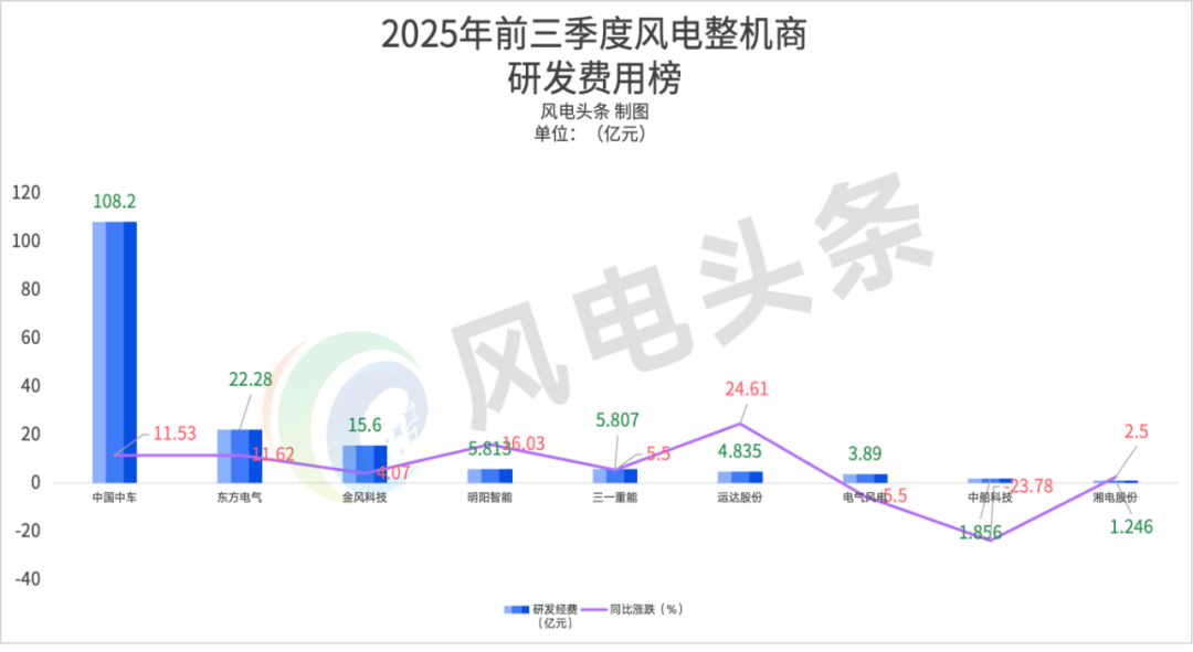 東方電氣以22.28億元的研發投入排名第二,第三名金風科技研發費用高達15.6億元。