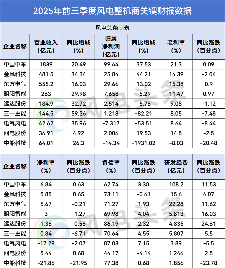 2025年前三季度,風電整機商在行業發展浪潮中展現出鮮明的 “雙面性”:一方面,營收普遍增長、頭部企業訂單充足、研發投入持續加碼,彰顯出風電行業的韌性與潛力;另一方面,凈利潤承壓、毛利率下滑、資產負債率高企等問題,也暴露出行業競爭加劇、成本壓力攀升的現實挑戰。