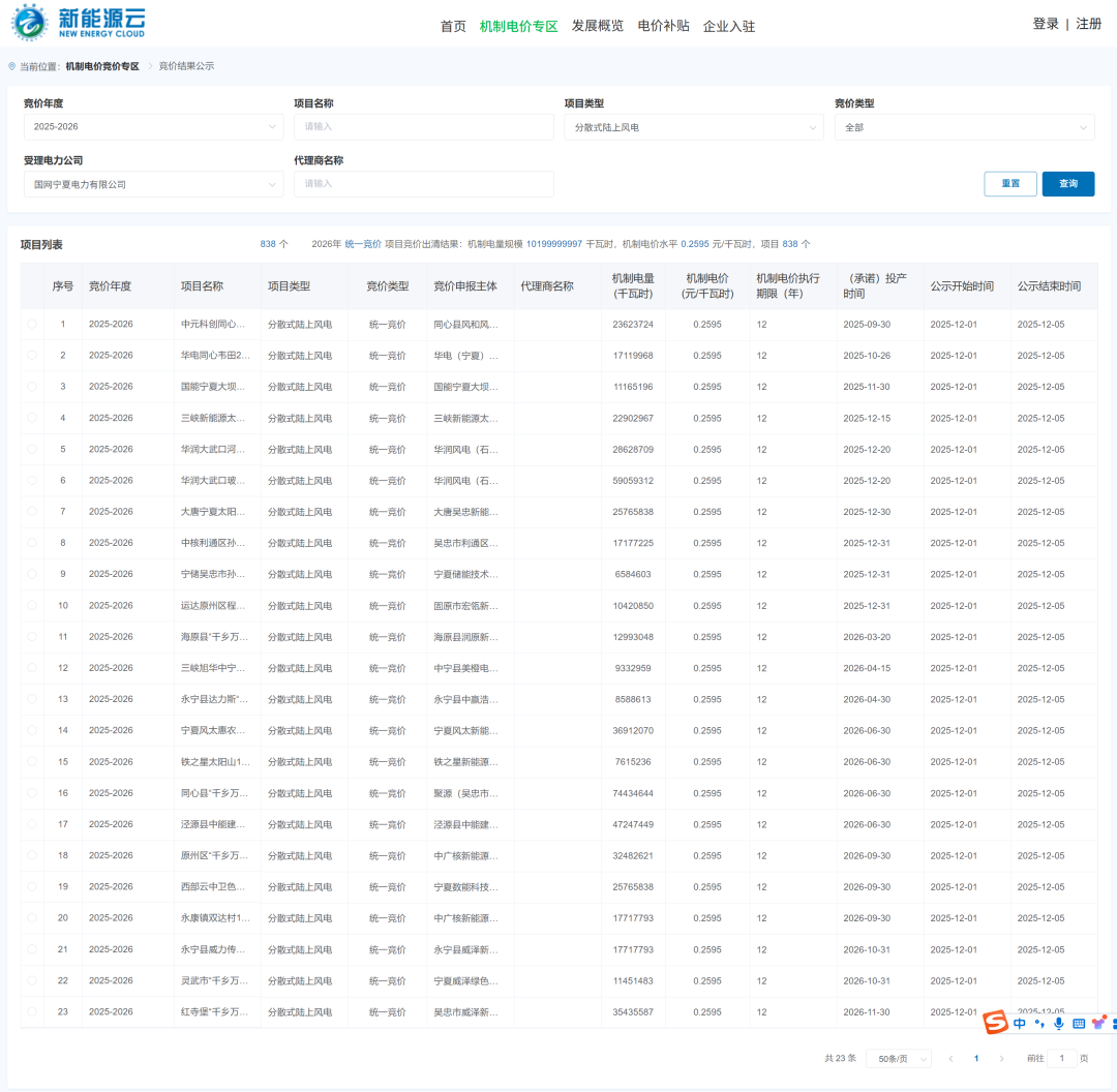風電頭條獲悉,12月1日,國網新能源云公示2026年度寧夏增量新能源項目機制電價競價結果。