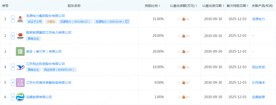 企查查股權穿透顯示,該公司由龍源電力、國家能源集團江蘇電力有限公司、雄亞(維爾京)有限公司、江蘇悅達投資股份有限公司、天順風能旗下江蘇長風海洋裝備制造有限公司、遠景能源有限公司等共同持股。