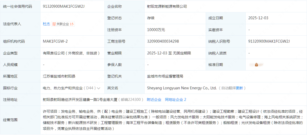 風電頭條獲悉,近日,射陽龍源新能源有限公司成立,注冊資本1億元。經營范圍包含:風力發電技術服務;太陽能發電技術服務;電氣設備修理;海上風電相關系統研發等。