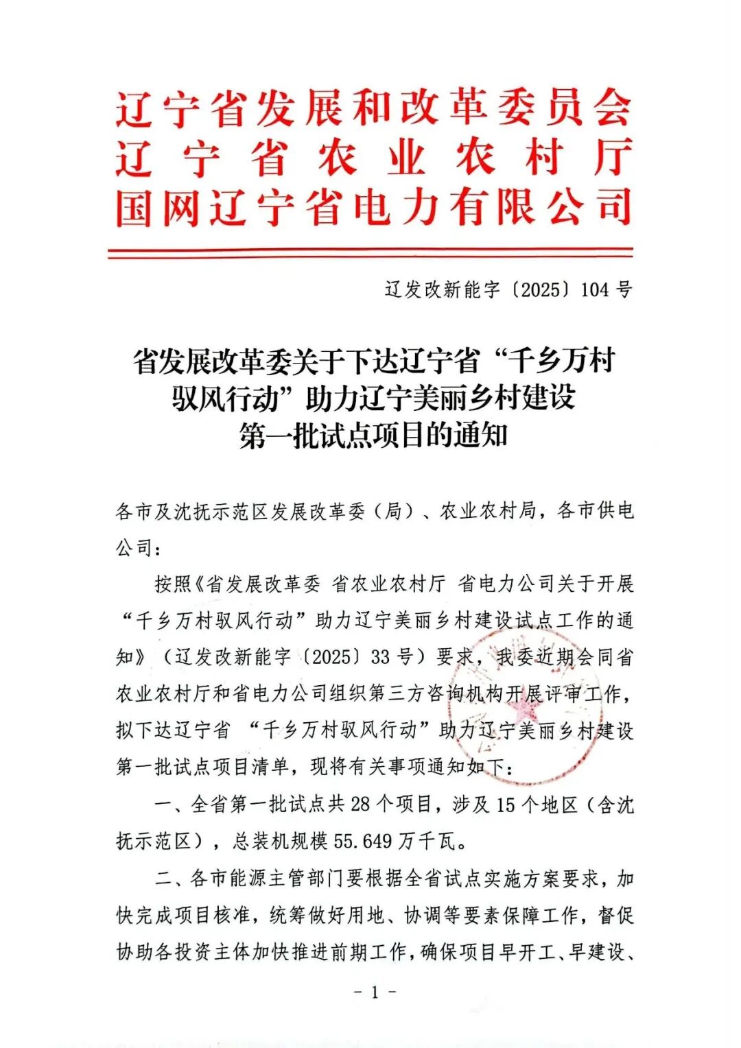 12月1日,遼寧省發改委、遼寧省農業農村廳、國網遼寧省電力有限公司發布《關于下達遼寧省“千鄉萬村馭風行動”助力遼寧美麗鄉村建設第一批試點項目的通知》。正泰新能源與大唐、中核、華電等企業共同入圍首批試點項目。根據《通知》,全省第一批試點共28個項目,涉及15個地區(含沈撫示范區),總裝機規模55.649萬千瓦。