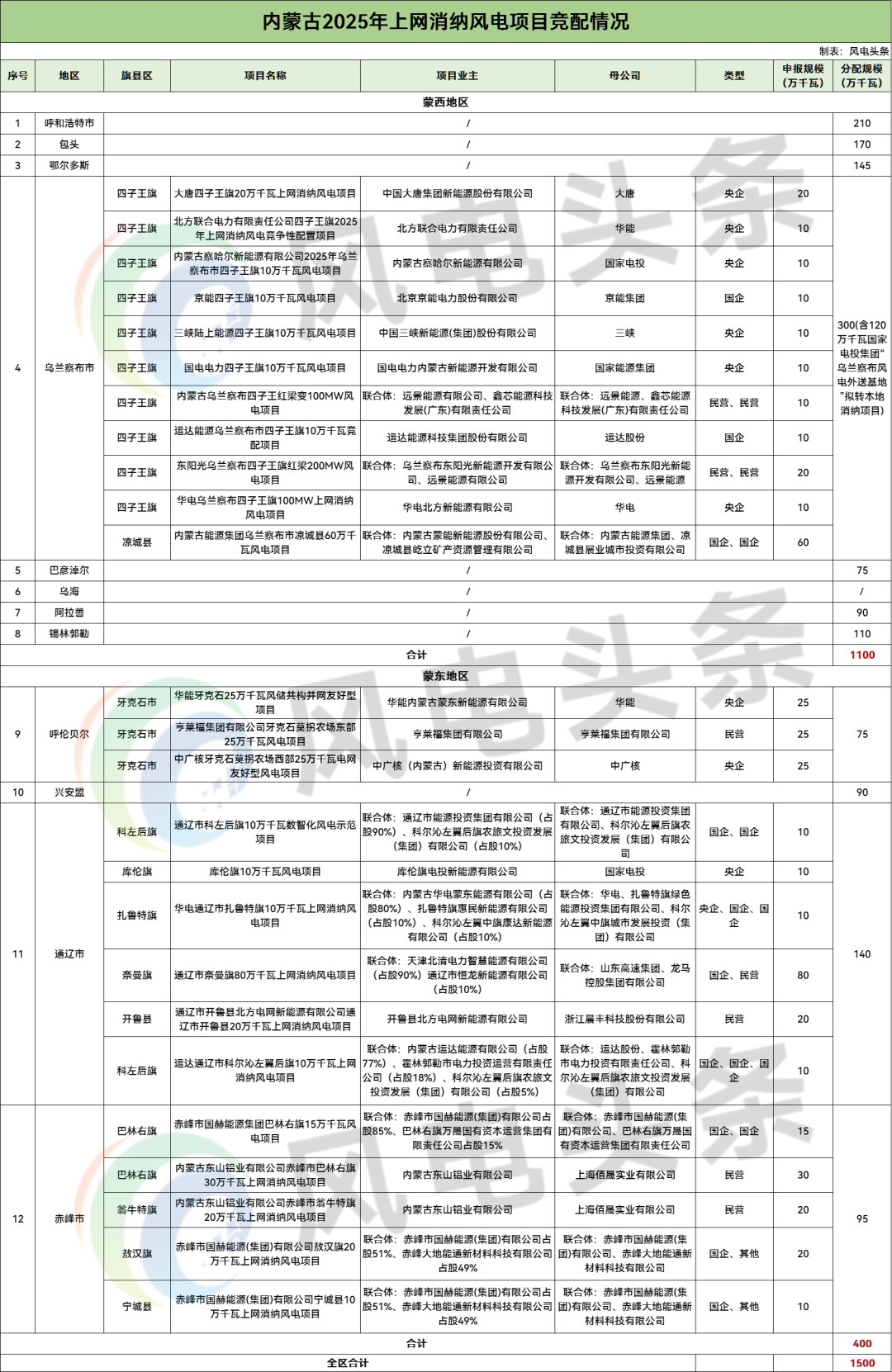共計劃安排全區上網消納風電項目建設規模1500萬千瓦,其中,蒙西地區 1100萬千瓦,蒙東地區400萬千瓦。