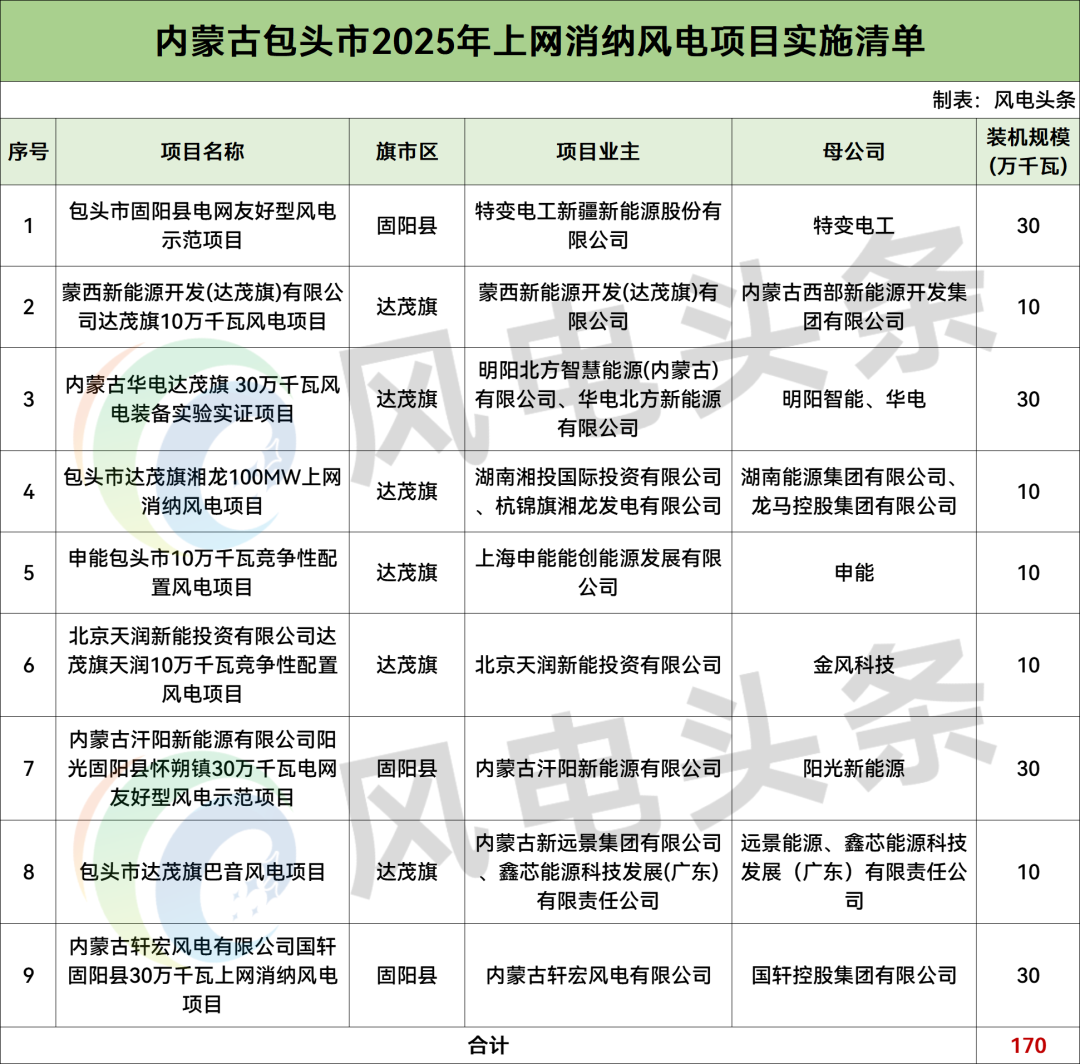 包頭市2025年競爭性配置上網消納風電項目共9個,規模合計170萬千瓦。