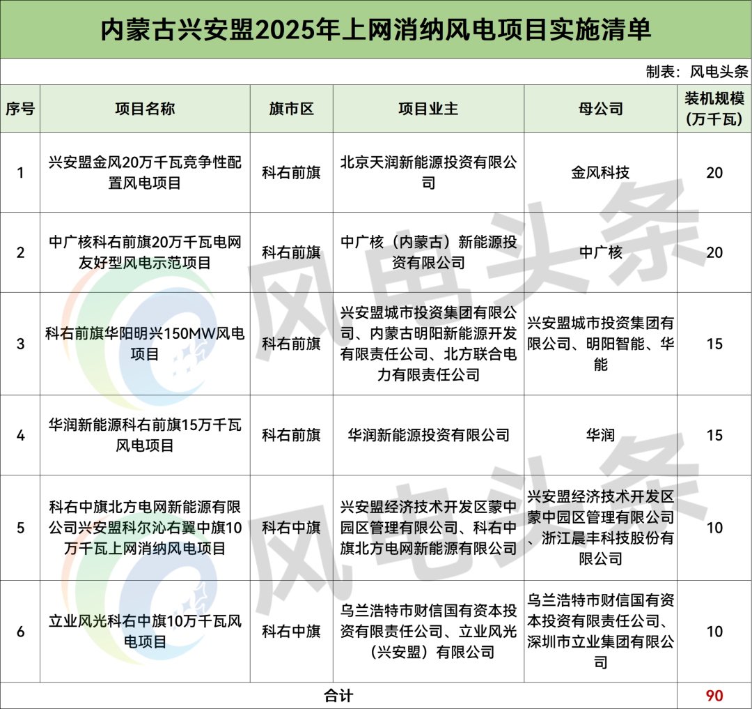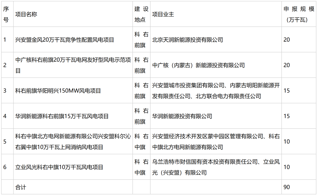 根據公示,興安盟2025年競爭性配置上網消納風電項目共6個,規模合計90萬千瓦。