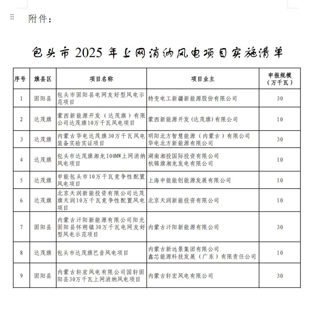 附件:包頭市2025年上網消納風電項目實施清單