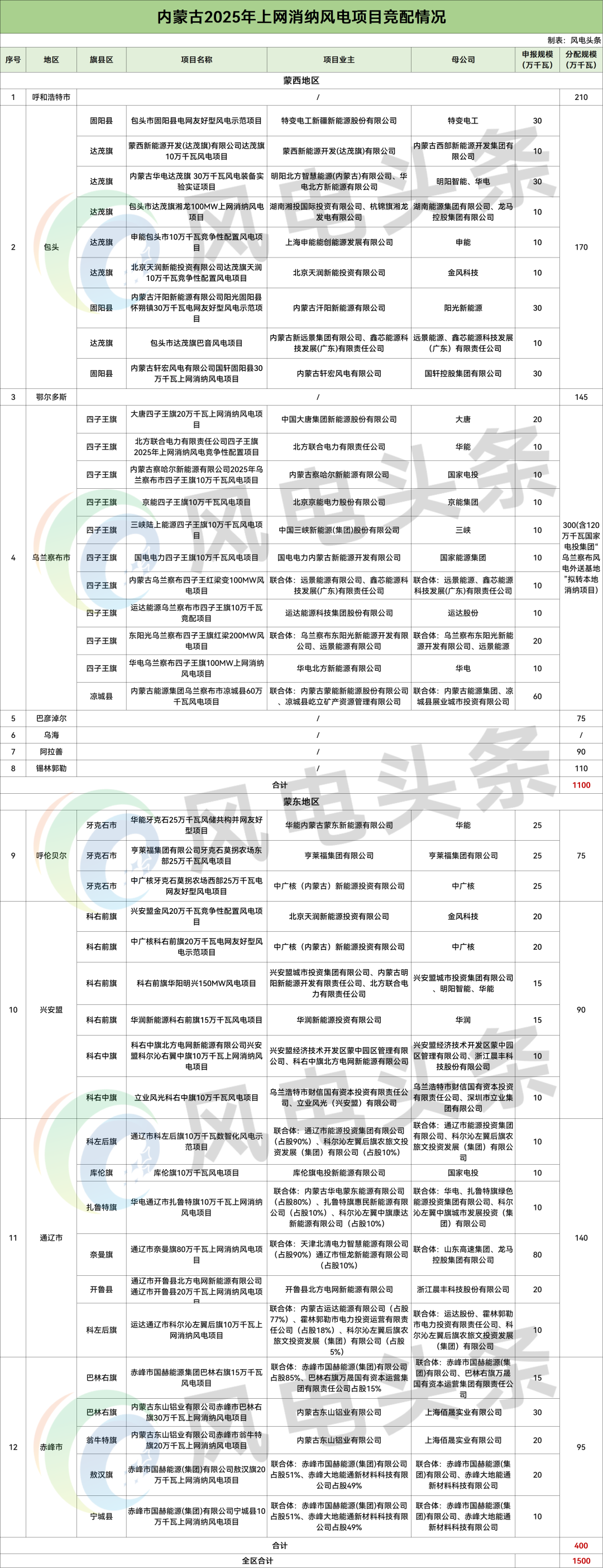 風電頭條獲悉,12月13日、15日,內蒙古包頭市、興安盟2025年競爭性配置上網消納風電項目結果公示,規模合計260萬千瓦。