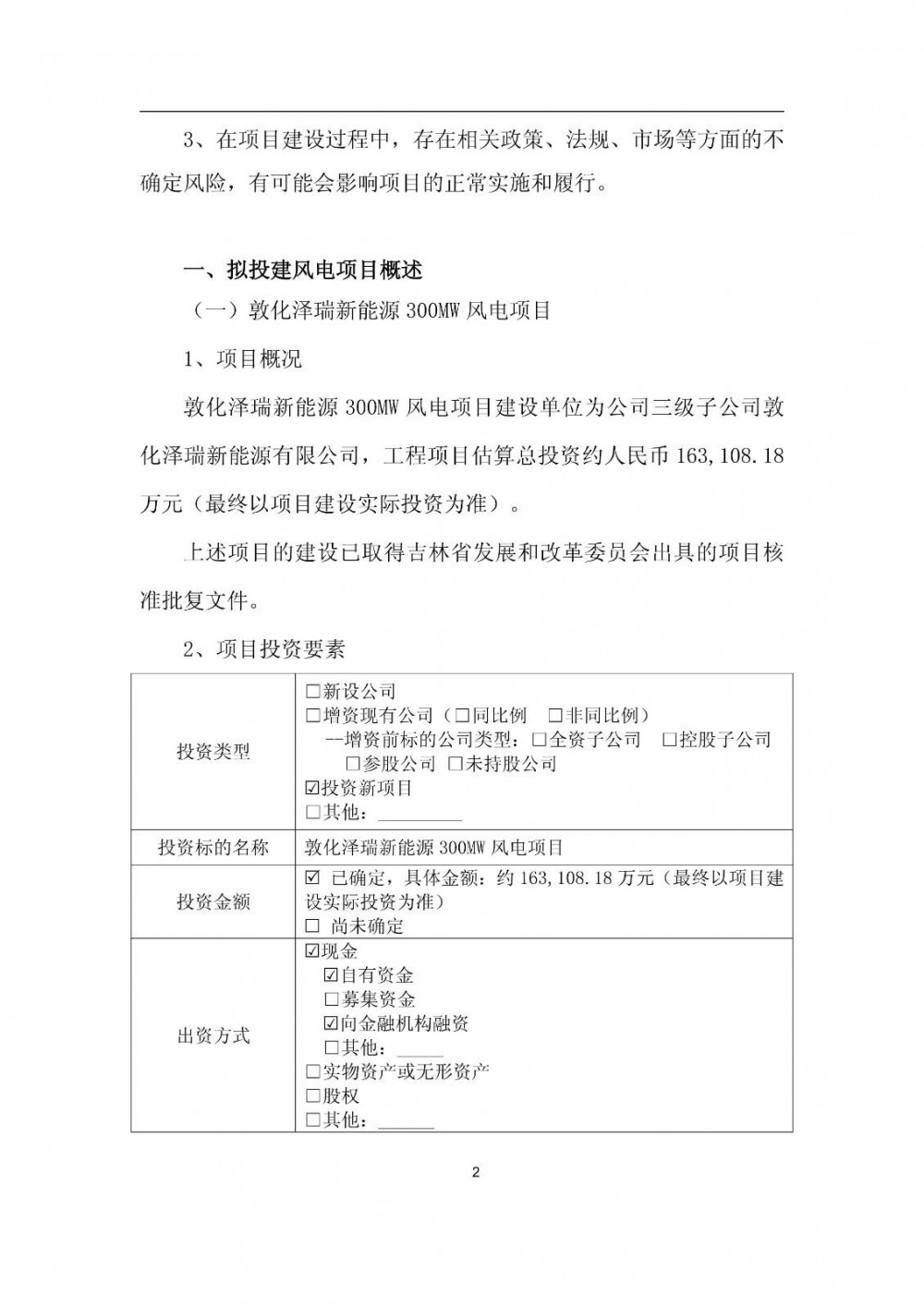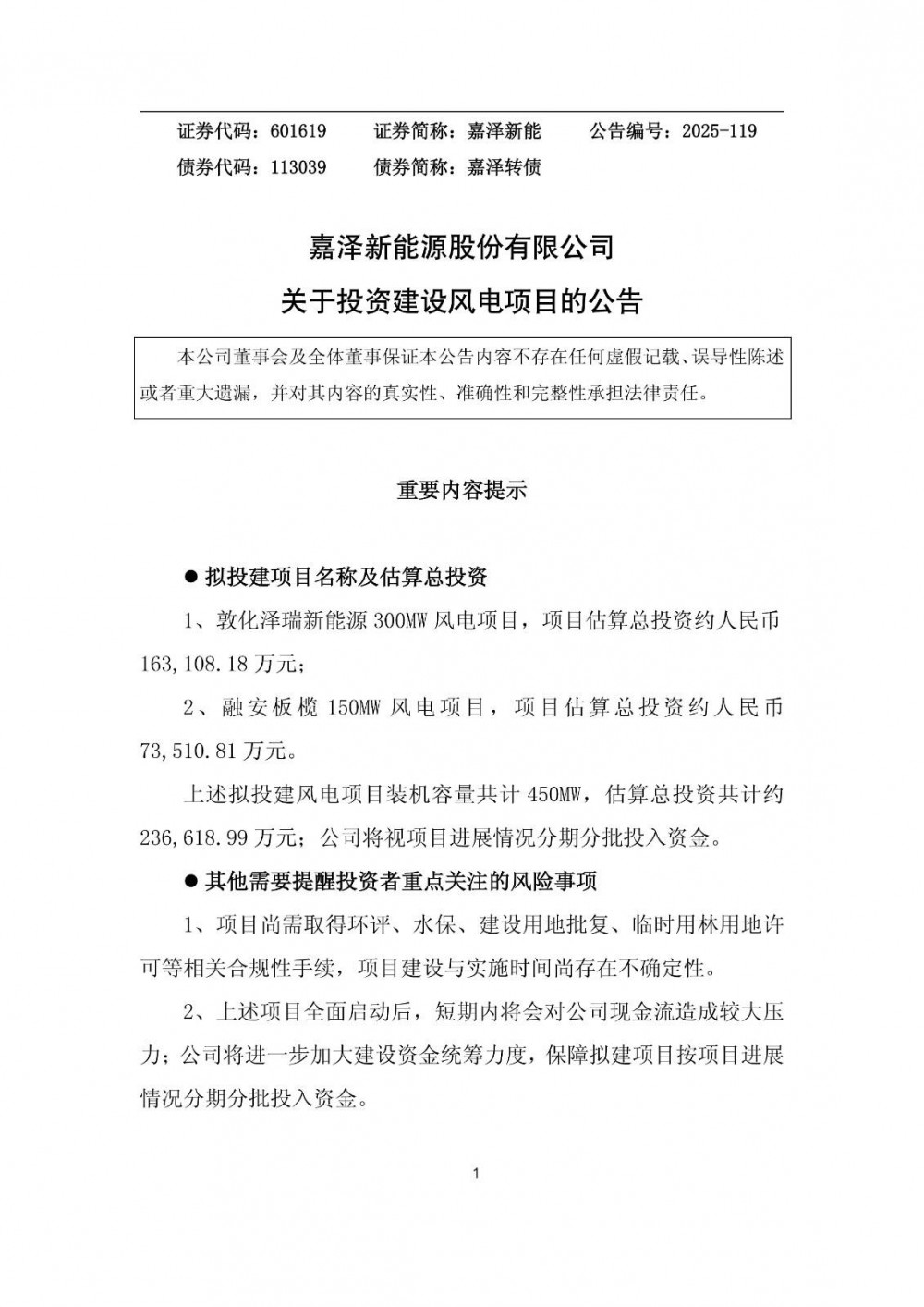 12月14日,嘉澤新能公告稱,公司擬投建兩個風電項目,其中,敦化澤瑞新能源300MW風電項目,該項目建設單位為公司三級子公司敦化澤瑞新能源有限公司,項目估算總投資約16.31億元;融安板欖150MW風電項目,該項目建設單位為公司二級控股子公司柳州博陽廣能新能源有限公司,項目估算總投資約7.35億元。