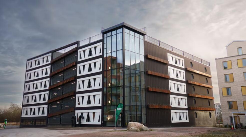 該停車場由隆德市停車管理公司 (LKP) 所有,位于瑞典南部隆德市郊的新興布倫斯霍格區。停車場共有五層,設有 365 個停車位,包括 40 個充電樁和一個儲能系統。瑞典電力公司 Vattenfall 為該建設項目捐贈了 57 個旋翼葉片,這些葉片被用于建造所謂的“幕墻”——覆蓋建筑立面大部分區域的非承重墻。