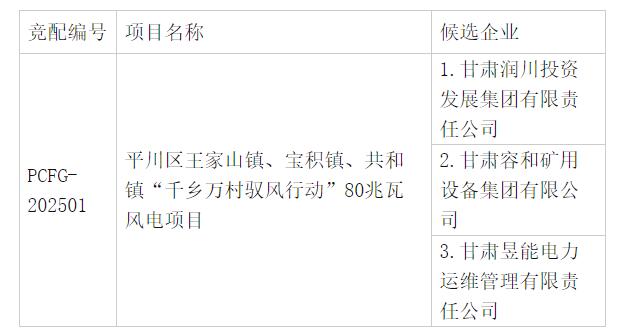 2025年12月22日,甘肅省白銀市平川區王家山鎮、寶積鎮、共和鎮“千鄉萬村馭風行動”80兆瓦風電項目競爭性配置評審結果公示,甘肅潤川投資發展集團有限責任公司、甘肅容和礦用設備集團有限公司、甘肅昱能電力運維管理有限責任公司三家企業入選。