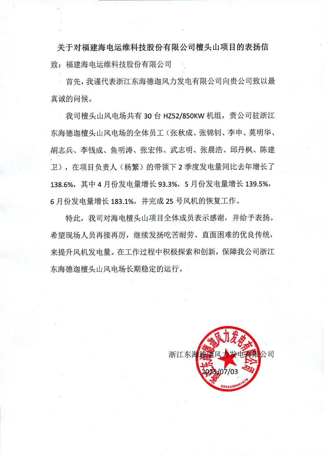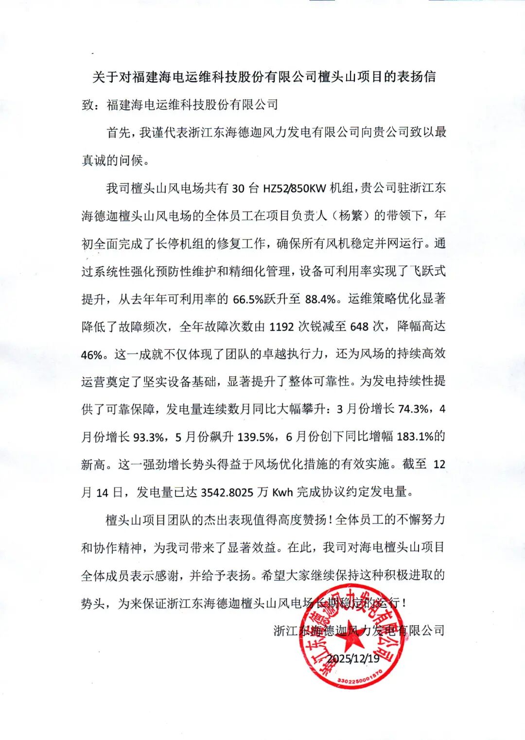 項目部在提升設備可靠性與發電效益方面的不懈努力與突出成效,獲得了業主方的高度認可。全年累計收到五封表揚信,充分肯定了團隊運維工作與成果,更為團隊持續精進、再創佳績注入了強勁動力。