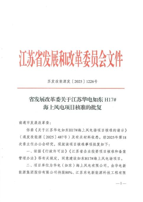 在江蘇公司上下勠力同心、高效協同推進下,2025年12月24日,江蘇華電如東H17#45萬千瓦海上風電項目成功取得核準,為公司決勝“十四五”戰略收官提供了重要支撐。