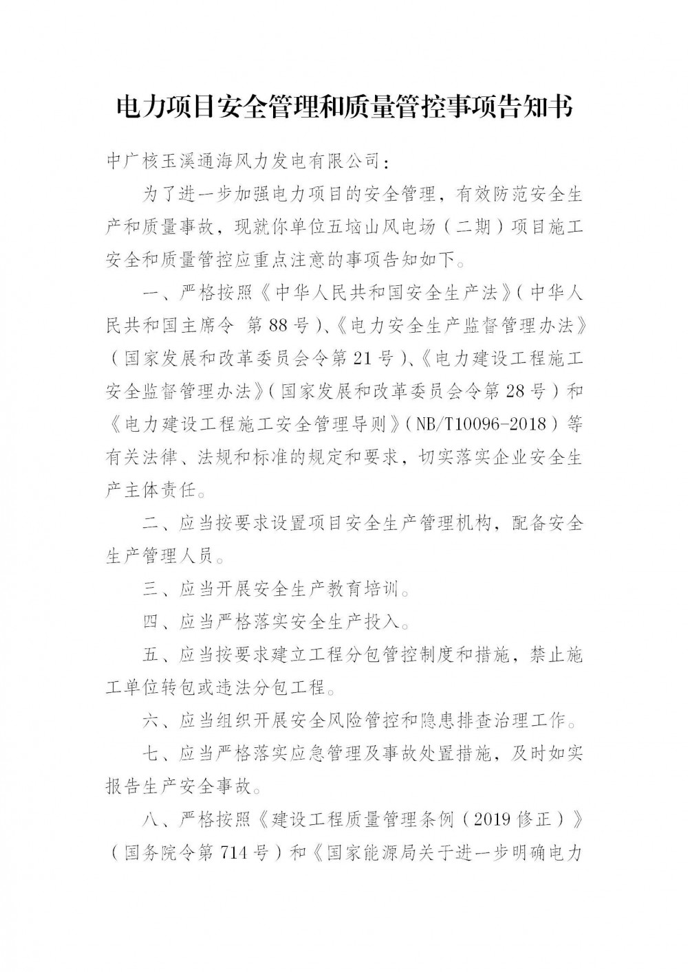 六、請項目法人嚴格按照《建設工程質量管理條例(2019修正)》(國務院令第714號)、《電力建設工程施工安全監督管理辦法》(國家發展和改革委員會令第28號)和《電力建設工程施工安全管理導則》(NB/T10096-2018)等有關法律法規和標準的要求,切實履行安全生產主體責任,做好施工安全管理和工程質量管控等各項工作,有效防范安全生產和質量事故的發生。請省能源局加強對項目在施工安全和工程質量等方面的監督管理,杜絕違規開工等行為。