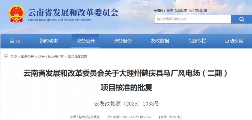 12月25日,云南省發展和改革委員會發布關于大理州鶴慶縣馬廠風電場(二期)項目核準的批復。