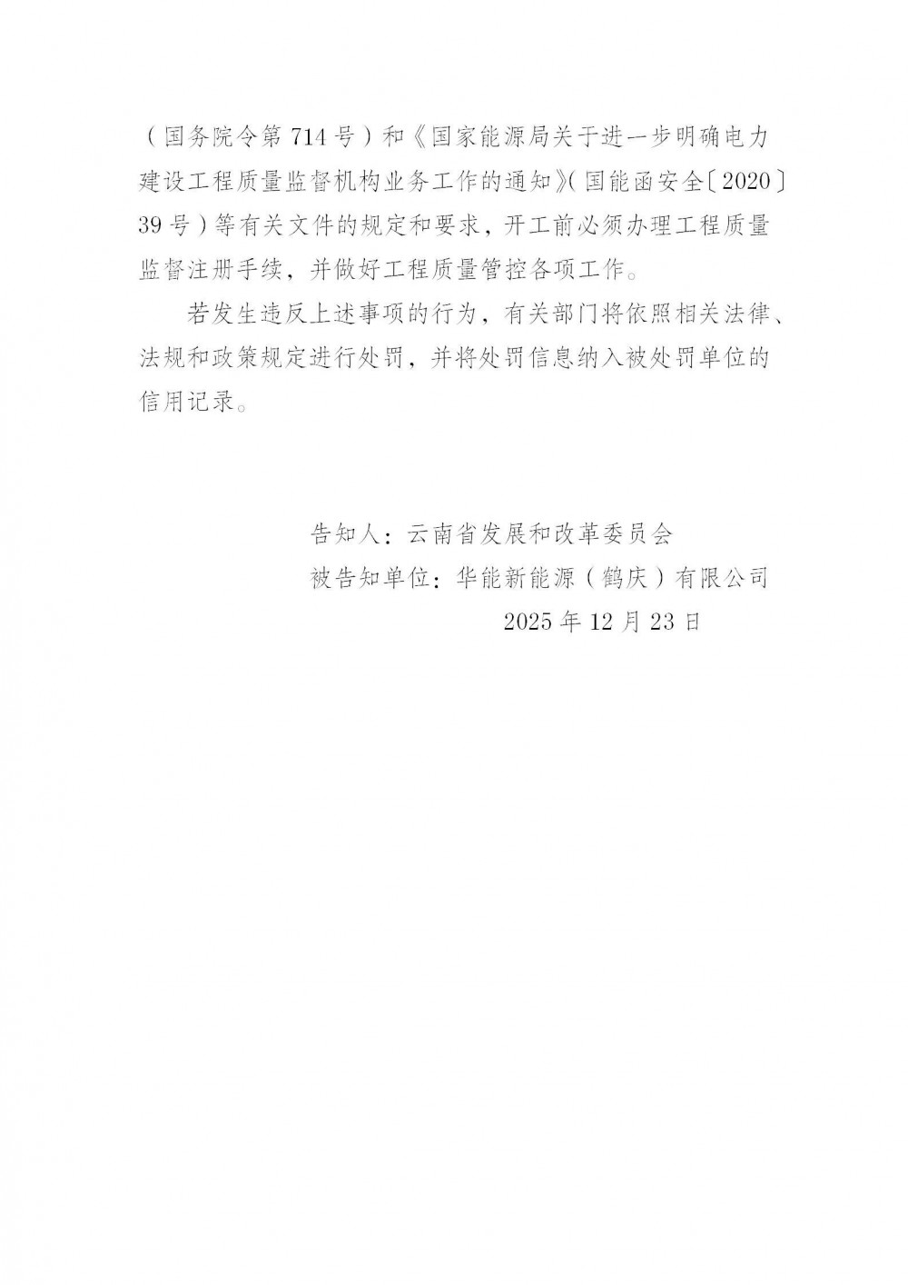 六、請項目單位嚴格按照《建設工程質量管理條例(2019修正)》(國務院令第714號)、《電力建設工程施工安全監督管理辦法》(國家發展和改革委員會令第28號)和《電力建設工程施工安全管理導則》(NB/T10096-2018)等有關法律、法規和標準的要求,切實履行安全生產主體責任,做好施工安全管理和工程質量管控等各項工作,有效防范安全生產和質量事故的發生。請省能源局加強對項目在施工安全和工程質量等方面的監督管理,杜絕違規開工等行為。