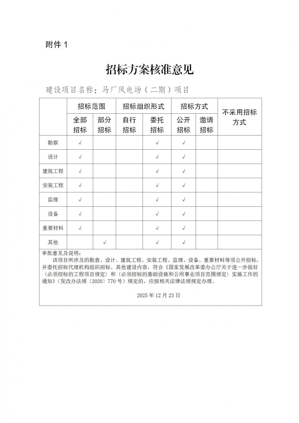 一、馬廠風電場(二期)已列入《云南省發展和改革委員會 云南省能源局關于印發云南省2024年第二批新能源項目開發建設方案的通知》(云能源新能〔2024〕194號),項目建設符合云南省新能源實施計劃。為有效利用當地風能資源,提高區域供電能力,依據《云南省人民政府關于印發云南省企業投資項目核準和備案實施辦法的通知》(云政規〔2023〕2號)、《云南省發展和改革委員會關于印發規范風電項目核準管理有關事項的通知》(云發改能源規〔2023〕2號)等有關規定,同意建設馬廠風電場(二期)項目(項目代碼:2505-530000-04-01-767518)。項目單位為華能新能源(鶴慶)有限公司。