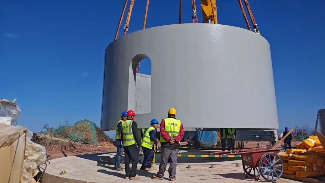 該項目采用當前國內先進的混合塔筒(混塔)結構,單機容量達6.25MW,是廣西地區少有的高塔筒、大功率陸上風電項目。其風機參數極具挑戰性:輪轂高度140米,輪轂重45噸;機艙(含箱變)約74噸;傳動鏈總成重達81噸;單片葉片長108米、重34.68噸(含工裝)。尤為特殊的是,塔筒由37環混凝土塔段+1環鋼塔筒共38段組成,結構復雜、精度要求極高,對吊裝工藝提出了前所未有的高要求。