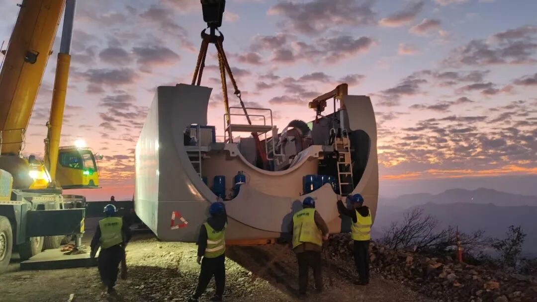 值得一提的是,項目地處山區,進場道路狹窄、彎道多,大型部件運輸困難。佳龍吊裝提前協調地方政府,修繕臨時便道,夜間錯峰運輸,保障百米級葉片安全抵達。在葉片吊裝階段,團隊創新采用“單葉片空中翻身+自研工裝”工藝,有效規避了傳統三葉一體吊裝對場地和風速的嚴苛限制,大幅提升了作業安全性與效率。