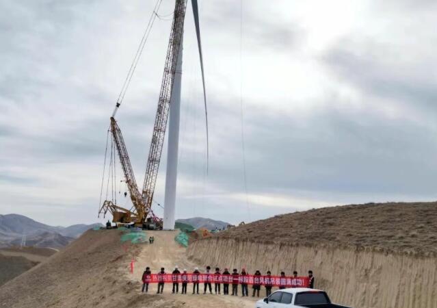 項目所在地甘肅環縣地處毛烏素沙漠邊緣,土質疏松、溝壑縱橫,山地與斷谷、盆地相間分布、地勢起伏大,進場道路狹窄,給長達百余米的風機葉片、近百噸重的塔筒和機艙運輸帶來巨大困難,為此,項目團隊對運輸路線反復踏勘和加固,確保了設備安全進場。面對寒冬山區多變的風況、陣風頻繁以及高空吊裝對風速、能見度的嚴苛要求,項目團隊抓住短暫的“黃金窗口期”,優化吊裝方案,嚴格落實安全交底與專項培訓,確保每一個環節都萬無一失。盡管山頂作業平臺狹窄、吊裝空間受限,且需統籌風電安裝與光伏場區建設的雙線作戰,但通過項目團隊與總包方的密切協作,現場施工安全有序、質量可控,最終順利完成了首臺機組的吊裝。