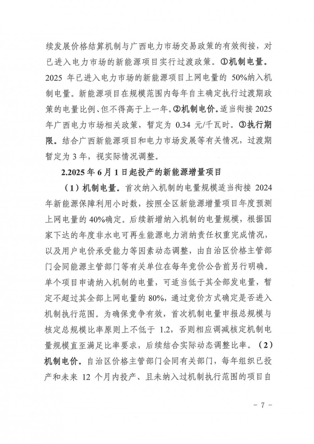機制電價。適當銜接2025年廣西電力市場相關政策,暫定為0.34元/千瓦時。