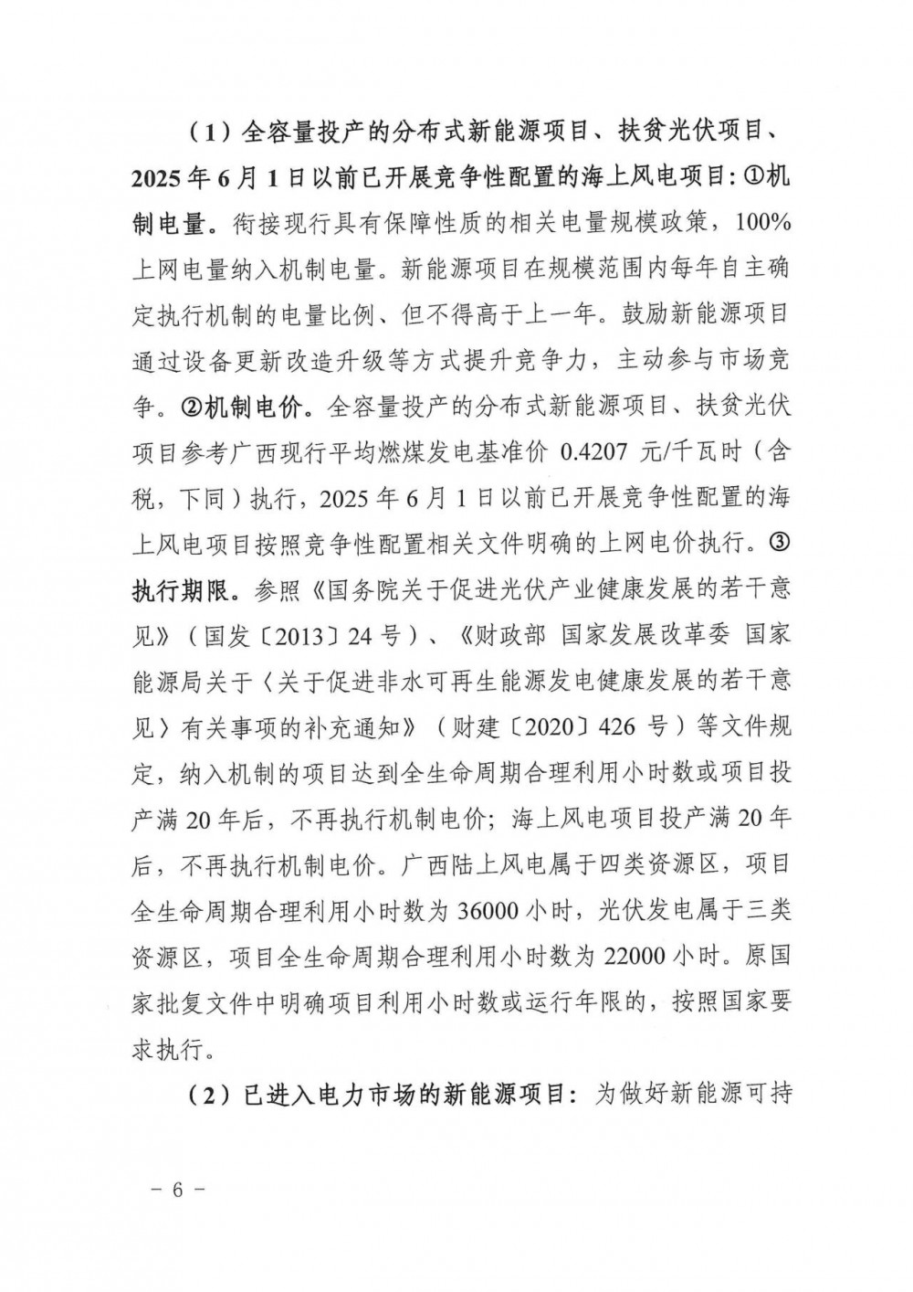 執行期限。參照<<國務院關于促進光伏產業健康發展的若干意見>>(國發[2013]24號)、<<財政部國家發展改革委國家能源局關于<關于促進非水可再生能源發電健康發展的若干意見>有關事項的補充通知>>(財建[2020]426號)等文件規定,納入機制的項目達到全生命周期合理利用小時數或項目投產滿20年后,不再執行機制電價;海上風電項目投產滿20年后,不再執行機制電價。廣西陸上風電屬于四類資源區,項目全生命周期合理利用小時數為36000小時,光伏發電屬于三類資源區,項目全生命周期合理利用小時數為22000小時。原國家批復文件中明確項目利用小時數或運行年限的,按照國家要求執行。