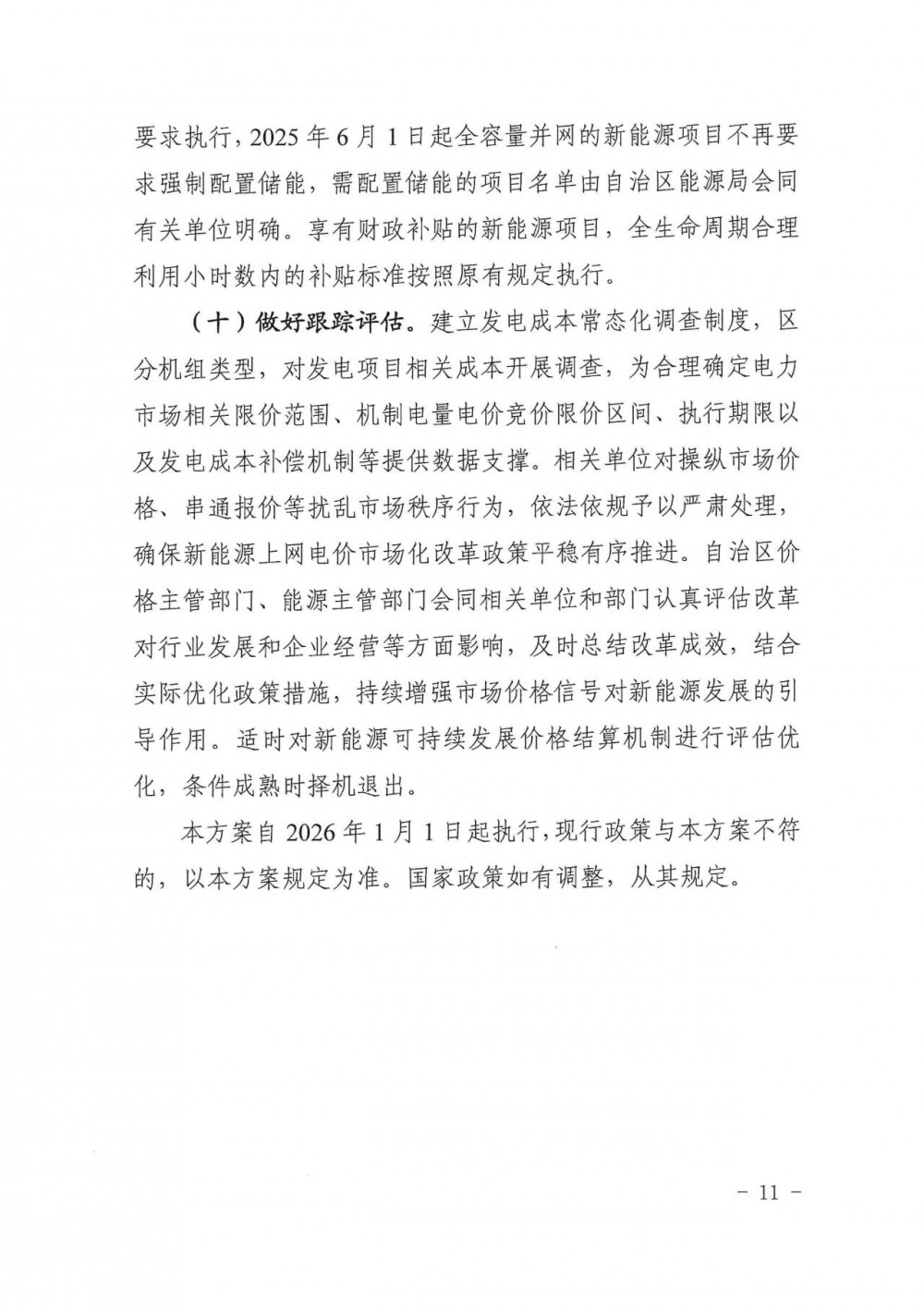執行期限。入選的增量項目機制電價執行期限為12年,執行期限精確到月,當月到期后,次月退出,執行期限到期后不再執行機制電價,新能源項目通過參與電力市場交易形成上網電價。入選時已投產的項目,原則上以入選時間的次月1日為執行起始時間。入選時未投產的項目,以項目申報的投產時間的次月1日為執行起始時間;如實際投產時間晚于申報投產時間,實際投產前覆蓋機制電量自動失效,執行期限不順延。在桂能源企業要加強項目管理,避免延期投產的情況出現。新能源增量項目競價由自治區價格主管部門會同能源主管部門委托相關單位制定具體競價規則、結算規則,并組織開展具體競價工作,競價規則和結算規則報自治區價格主管部門、能源主管部門批復后執行。