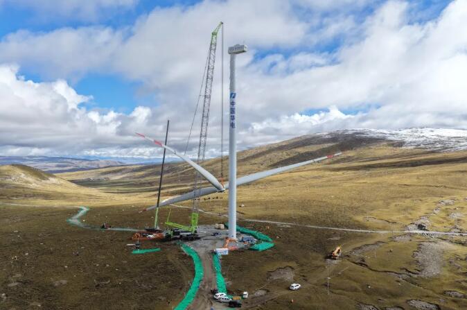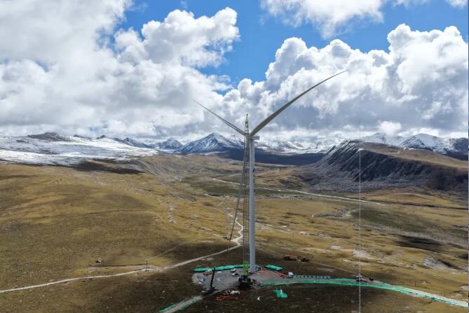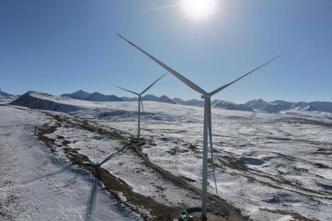在工程建設中,面對高寒缺氧、晝夜溫差大、風速變化快、極端天氣頻發等多重挑戰,項目黨支部組織黨員突擊隊帶頭以"分段除雪、車輛接力"方式保障運輸;項目團隊通過添加專用防凍劑、啟用智能溫控系統,攻克大體積混凝土連續澆筑技術難關;創新采用單葉片與整體葉片結合吊裝工藝,依托全景監控與無人機智能巡航系統,實現長97.3米、機艙高118米風機部件在復雜氣候條件下的毫米級精準吊裝;同時,項目團隊精準預判風力數據,動態調整作業窗口期,最大限度降低惡劣天氣對施工進度的影響;并網調試階段,結合西藏電網特點優化控制策略,依托構網型儲能平抑出力波動,保障機組穩定并網。