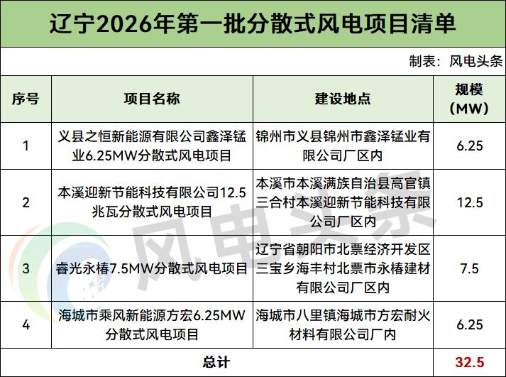 清單包含4個分散式風電項目,規模合計32.5MW。