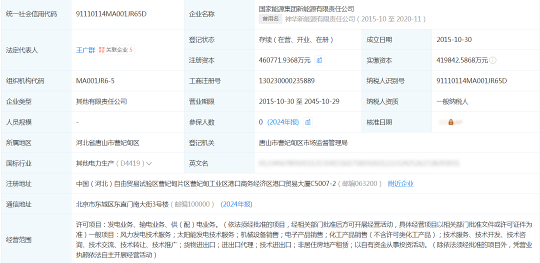 資料顯示,國家能源集團新能源有限責任公司成立于2015年10月30日,注冊地位于中國(河北)自由貿易試驗區曹妃甸片區曹妃甸工業區港口商務經濟區,法定代表人為王廣群。