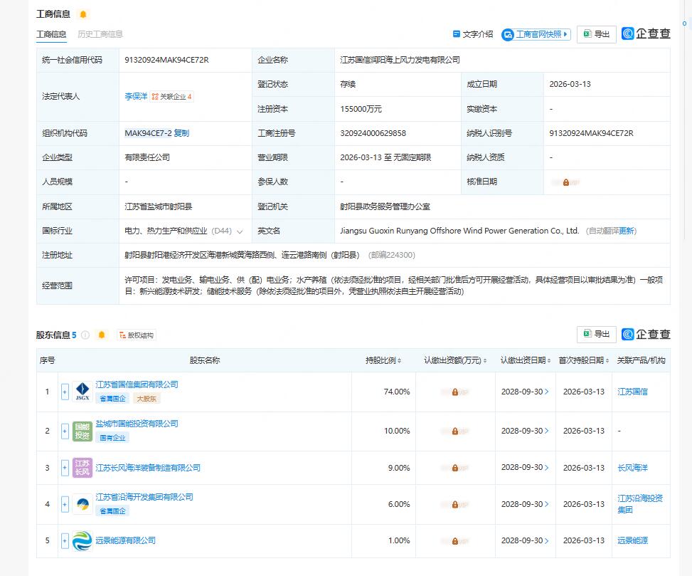企查查APP顯示,3月13日,江蘇國信潤陽海上風力發電有限公司成立,注冊資本15.5億元,董事長為李保洋,由江蘇省國信集團有限公司(74.00%)、鹽城市國能投資有限公司(10.00%)、江蘇長風海洋裝備制造有限公司(9.00%)、江蘇省沿海開發集團有限公司(6.00%)、遠景能源有限公司(1.00%)共同持股。