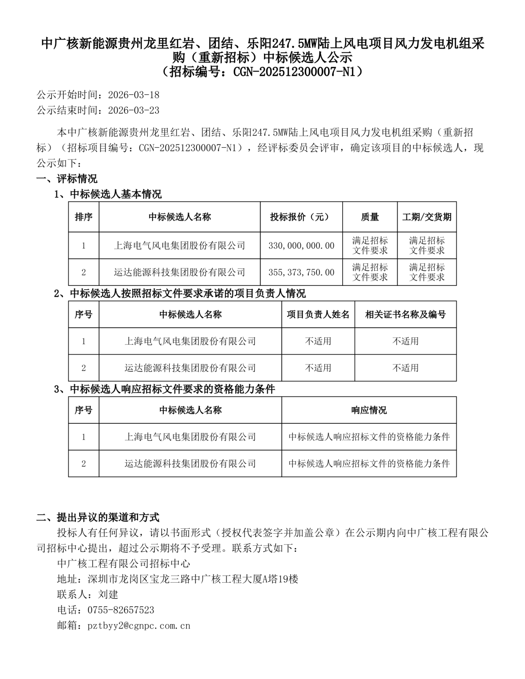 ?風電頭條獲悉,3月18日,中廣核山西方山80MW、榆社40MW、武鄉50MW陸上風電項目;中廣核新能源貴州龍里紅巖、團結、樂陽247.5MW陸上風電項目;中廣核新能源廣西欽北石古嶺200MW陸上風電項目風力發電機組采購中標候選人公示。