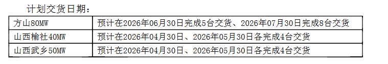 以上三個項目計劃交貨日期為:全部風電機組設備預計在2026年6月完成交貨最終交貨期以招標人書面正式通知為準(招標人提前二個月通知投標人)。投標人應滿足招標人初步擬定的交貨期,并提供自己的交貨進度具體方案。具體工期及進度要求以招標文件規定為準。