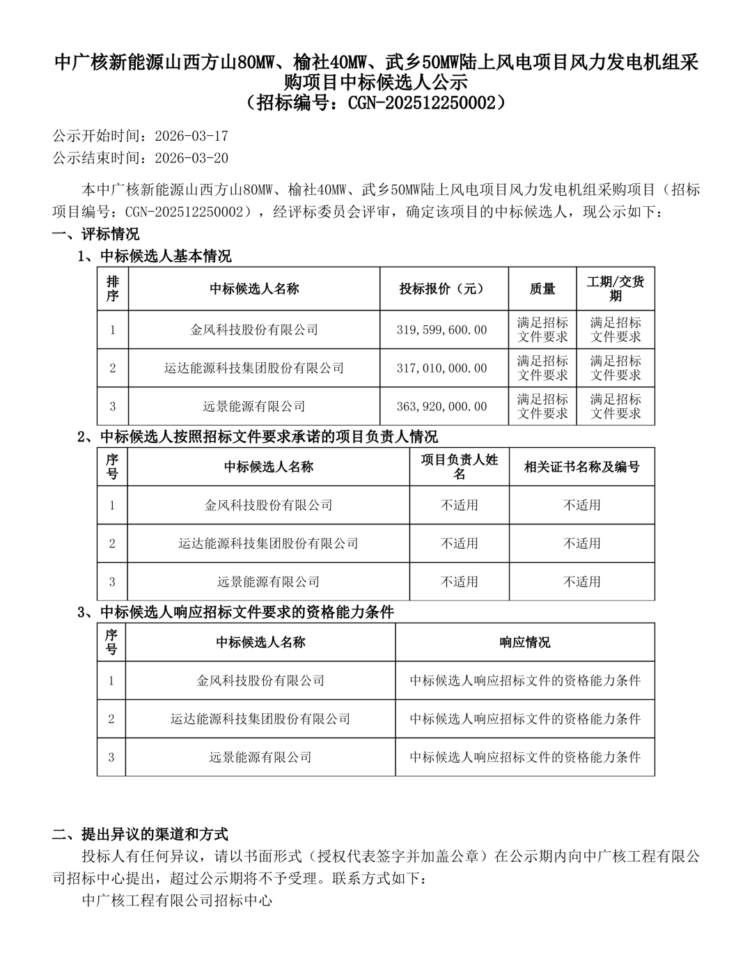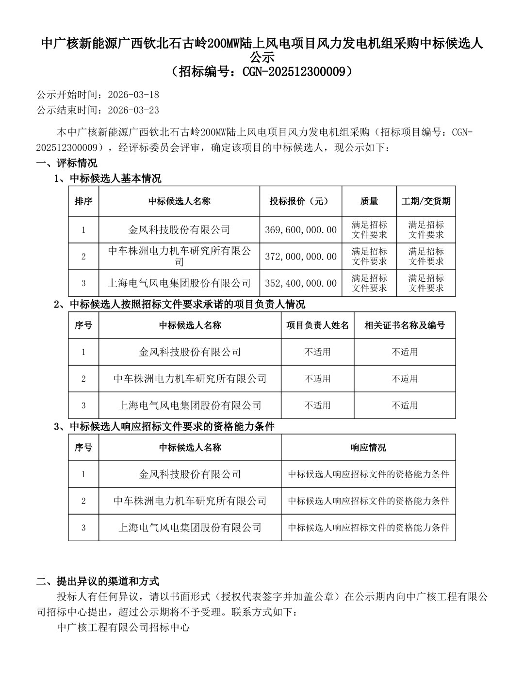 7、中廣核新能源廣西欽北石古嶺200MW陸上風電項目風力發電機組采購項目招標人為欽州廣金新能源有限公司,風電機組設備預計在2026年6月完成交貨,最終交貨期以招標人書面正式通知為準(招標人提前二個月通知投標人)。