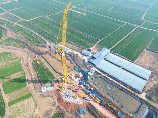 本項目安裝8臺風電機組,總裝機規模50兆瓦,機組輪轂中心高度160米,采用鋼-混凝土混合塔筒結構,兼具混凝土塔筒的穩定性與鋼塔的靈活性優勢,有效提升風能捕獲效率與項目經濟效益。本次吊裝的首段混塔為塔筒底段,底部外徑9.34米、混凝土塔筒高度3.6米、重量73.53噸,是整塔最重的核心部件之一。吊裝過程對設備精度、作業工藝及安全管控要求極高。