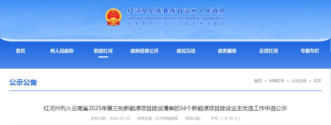 受紅河州能源局委托,紅河州建設工程招標有限公司于2026年3月19日9時、2026年3月20日9時在紅河州建設工程招標有限公司(紅河州蒙自市護國路1號紅建佳苑商網8號2樓會議室)組織完成了紅河州列入云南省2025年第三批新能源項目建設清單的34個新能源項目建設業主優選工作的評測工作。經評測專家組評測,委托方確認,現將中選結果公示如下: