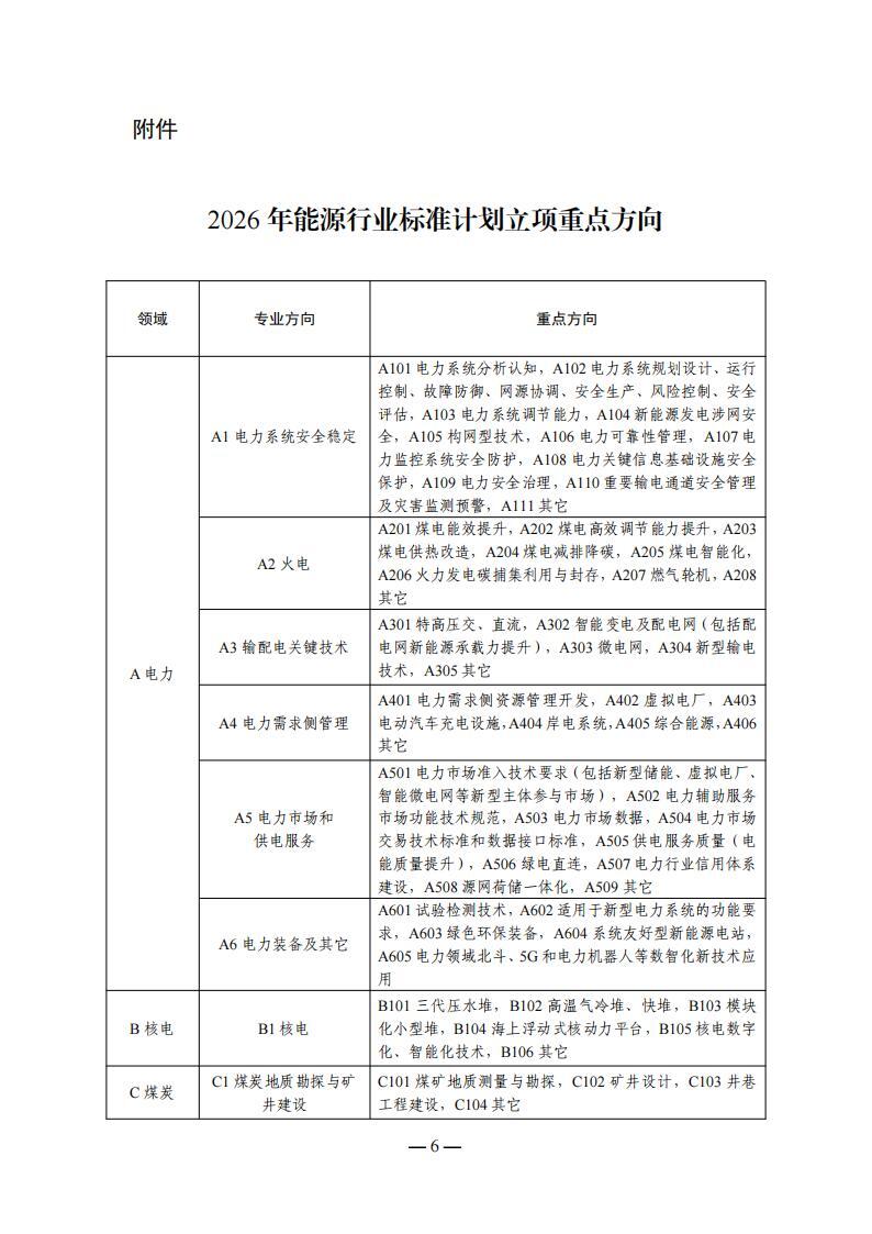2026年能源行業標準計劃立項重點領域包括8項,分別是電力,核電,煤炭,油氣,新能源和可再生能源,新型儲能和氫能,煉油、煤制油氣和綠色燃料,能源碳管理和產業創新融合發展。