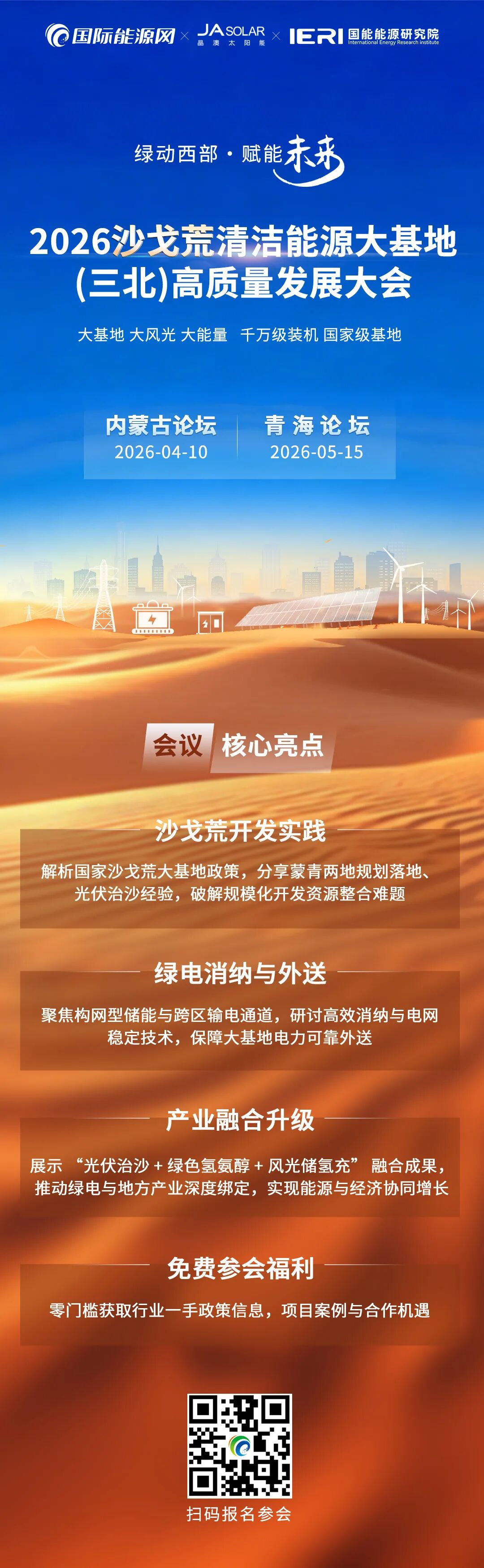為梳理政策導向、對接投資需求、深化技術創新,由國際能源網、國能能源研究院主辦,晶澳科技聯合主辦的2026沙戈荒清潔能源大基地(三北)高質量發展大會將于2026年4月10日和5月15日分別在呼和浩特市和西寧市召開。(點此查看大會議程)