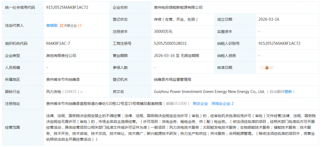 企查查顯示,3月16日,貴州電投綠能新能源有限公司成立,法定代表人為謝曉剛,注冊資本30000萬元,經營范圍包括風力發電技術服務;太陽能發電技術服務;儲能技術服務;技術服務、技術開發、技術咨詢、技術交流、技術轉讓、技術推廣;新興能源技術研發;熱力生產和供應;供冷服務;合同能源管理等。