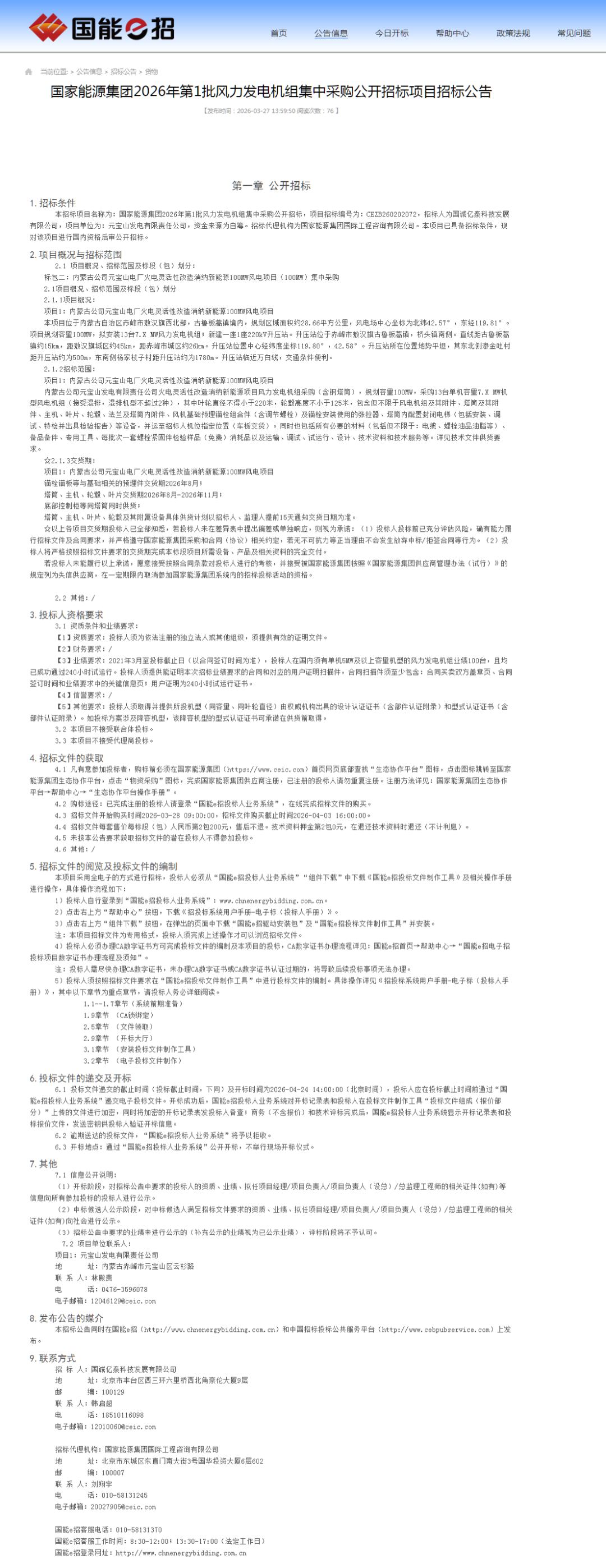 風電頭條獲悉,3月27日,國家能源集團2026年第1批風力發電機組集中采購公開招標項目招標公告發布。
