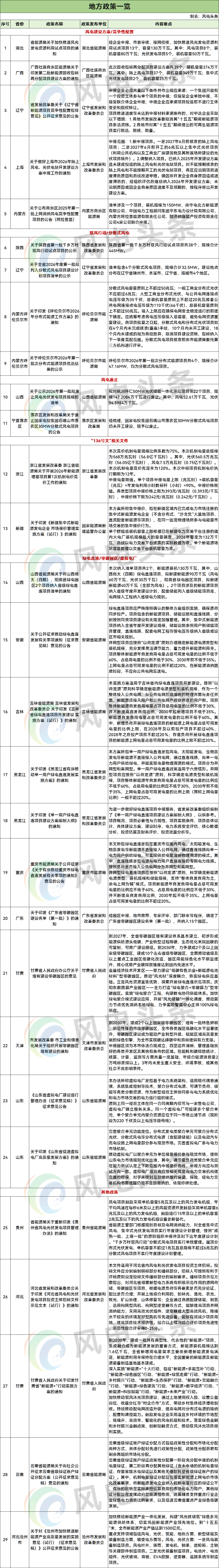 湖北、廣西、遼寧等5個地方下發相關文件。湖北發布加快推進風光發電資源利用試點項目;廣西印發第二批新能源回收指標再分配項目建設方案;上海啟動2026年陸上風電、光伏電站開發建設方案申報工作等。