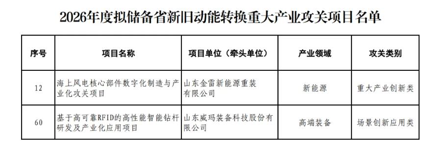 近日,山東省發改委公示了2026年度擬支持的省新舊動能轉換重大產業攻關儲備項目名單,東營市2個項目入選,分別是山東金雷新能源重裝有限公司實施的“海上風電核心部件數字化制造與產業化攻關項目”和山東威瑪裝備科技股份有限公司實施的“基于高可靠RFID的高性能智能鉆桿研發及產業化應用項目”。